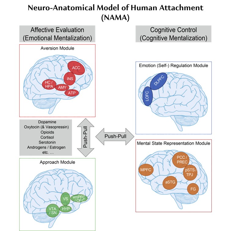 Before we can ask the question whether your brain is securely attached, we need to define which components typical attachment interactions comprise, and where and how these components are usually processed within our brains. We have recently developed a first neuro-anatomical model of human attachment (NAMA) that can help us do exactly that.