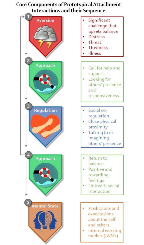 In the Figure below you can see the core components of prototypical attachment interactions and their sequence, according to NAMA. The following text explains each of the steps more in detail.