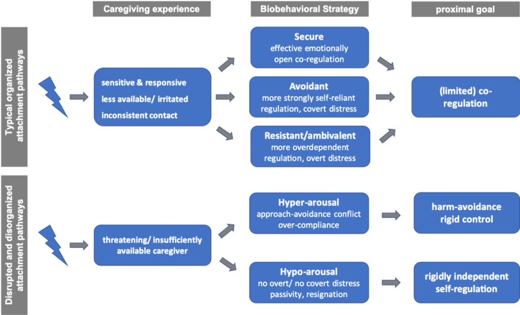 One possible approach for achieving such differentiation and specification is to look for dissociable pathways to attachment disorganisation (reflecting specific adaptations to particular caregiver behaviours). NAMDA proposes to distinguish between a hypo- and hyper-arousal subtype of attachment disorganisation, a distinction primarily derived from the caregiver either being a threat or providing insufficient co-regulation. In other words, in NAMDA, the ontogeny and aetiology of attachment disorganisation is associated with different experiences of maltreatment, either related to abuse or neglect. Such notion is in line with a dimensional model of childhood adversity involving two central dimensions of threat and deprivation proposed by McLaughlin & Sheridan (e.g., 2016).
