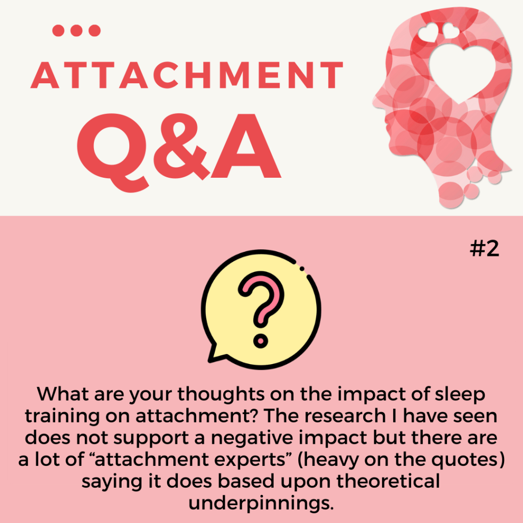 Speaking from an attachment theoretical perspective – and supported by indirect research on parents’ response to infant crying -, caregiver availability and sensitivity is likely to be more helpful for both sleep training and infant attachment development as such, as well as for the link between sleep training and infant attachment development.