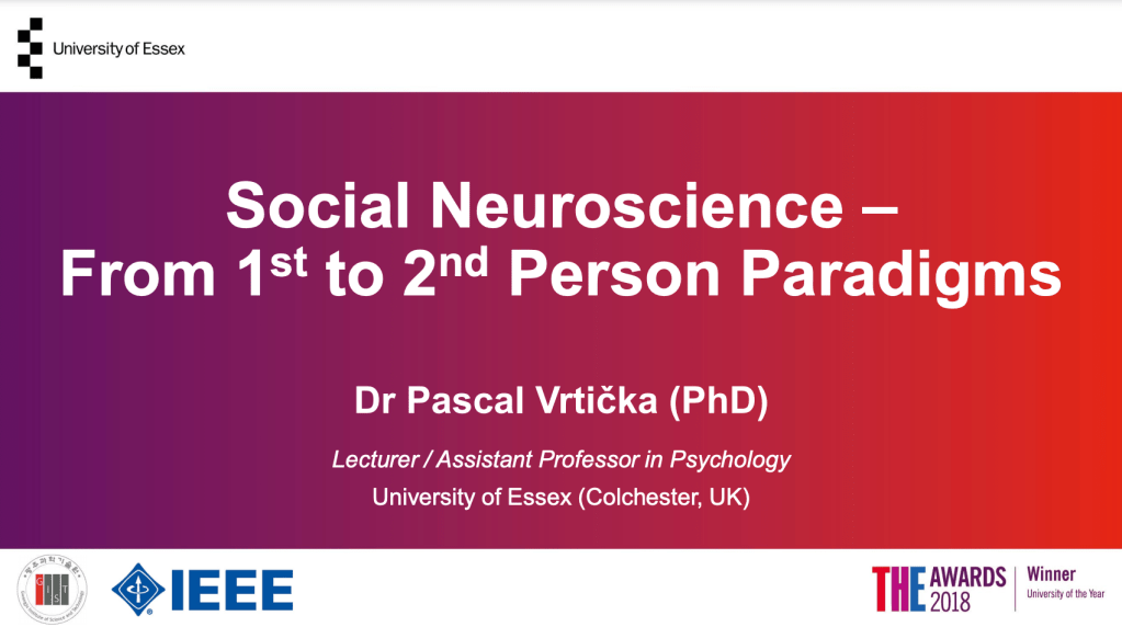 Another 45-minute overview of Social Neuroscience, outlining both 1st and 2nd person social neuroscience research performed within the SoNeAt Lab (“Social Neuroscience – From 1st to 2nd Person Paradigms“) is available to view here (talk by Dr Pascal Vrticka from March 18, 2021 at a virtual seminar for the Gwangju Institute of Science and Technology (GIST), Gwangju, South Korea & Institute of Electrical and Electronics Engineers (IEEE), Gwangju Section, South Korea).