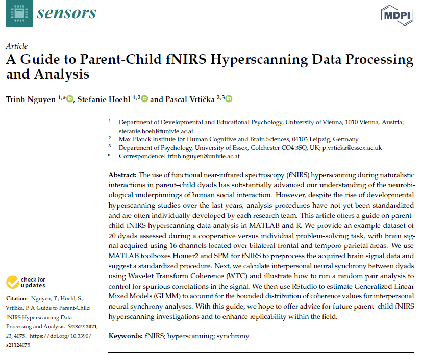 Nguyen, T., Hoehl, S., and Vrtička, P. (2021). A Guide to Parent-Child fNIRS Hyperscanning Data Analysis. Sensors (Section Biosensors; Special issue on “Brain Signals Acquisition and Processing”), 21, 4075. https://doi.org/10.3390/s21124075. OPEN ACCESS.