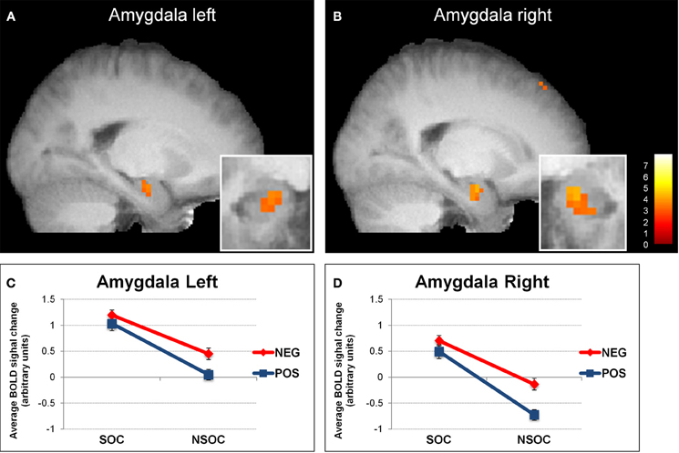 Firstly, activity was always higher to emotional versus neutral images. Second, activity was always higher to social versus nonsocial images. And third, while activity to social images did not significantly differ as a function of positive versus negative valence, it was higher for negative versus positive valence for nonsocial images (see Figure on the right illustrating such pattern in bilateral amygdala).