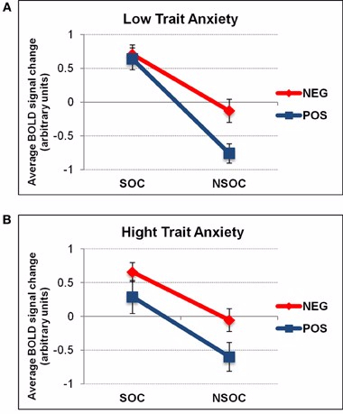 Interestingly, the above social by emotional relevance interaction in the right amygdala was modulated by the participants’ trait anxiety: the higher the participants’ trait anxiety, the weaker the interaction became (i.e., for high trait anxious participants, there was only a main effect of social and emotional relevance, but no longer an interaction). This effect was driven by a selective decrease of activity for the social positive condition with increasing trait anxiety scores. A putative explanation could be stronger habituation due to subjectively perceived lower relevance of social positive information for high trait anxious people.