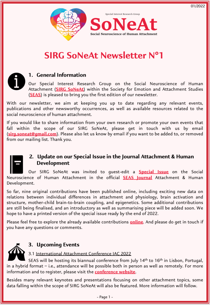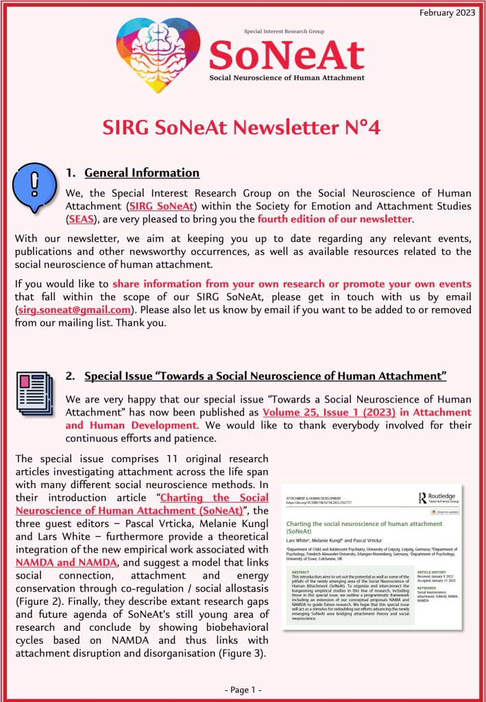 With our newsletter, we aim at keeping you up to date regarding any relevant events, publications and other newsworthy occurrences, as well as available resources related to the social neuroscience of human attachment.