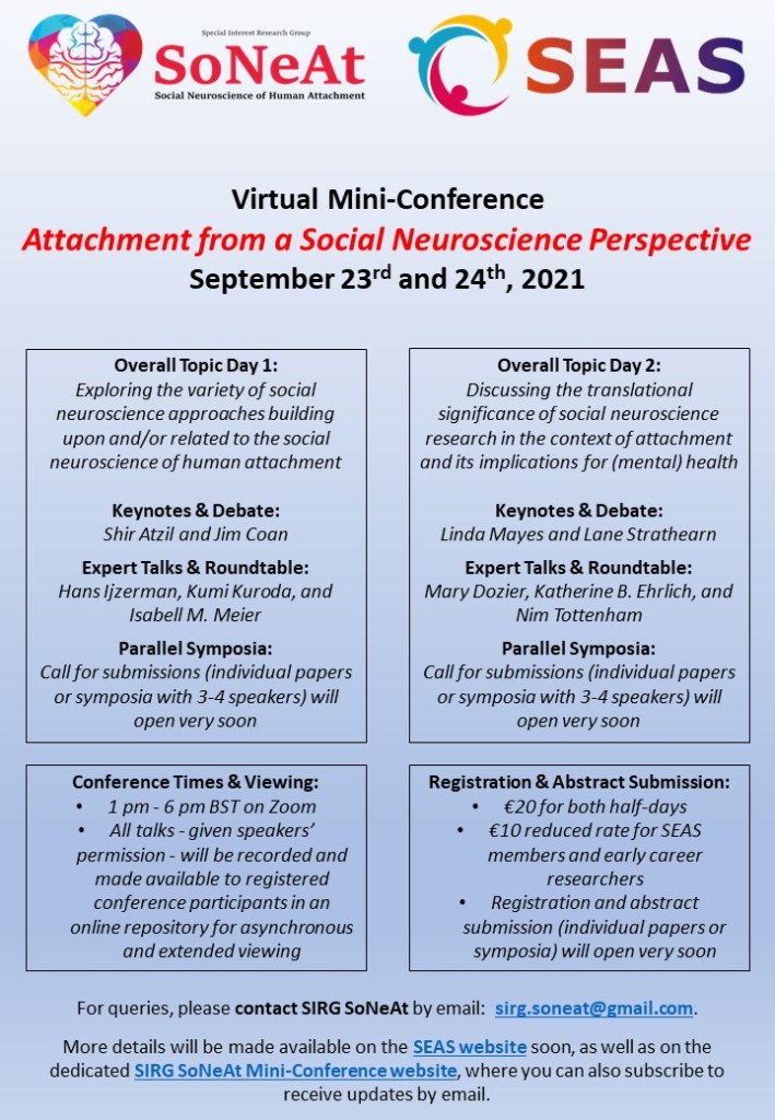Within the virtual mini-conference series organised by the Society for Emotion and Attachment Studies (SEAS) in 2021, SIRG SoNeAt had the honour of hosting the mini-conference on Attachment from a Social Neuroscience Perspective on September 23rd and 24th, 2021.