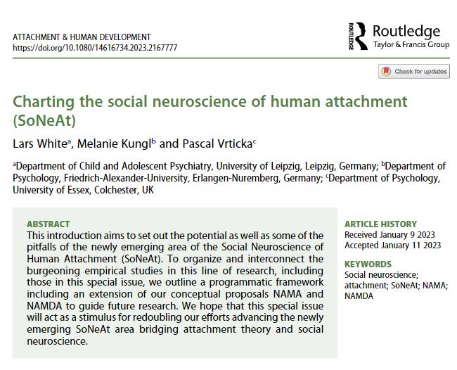 The introduction article “Charting the Social Neuroscience of Human Attachment” by the three guest editors Lars White, Melanie Kungl & Pascal Vrticka is available online (free access) here.
