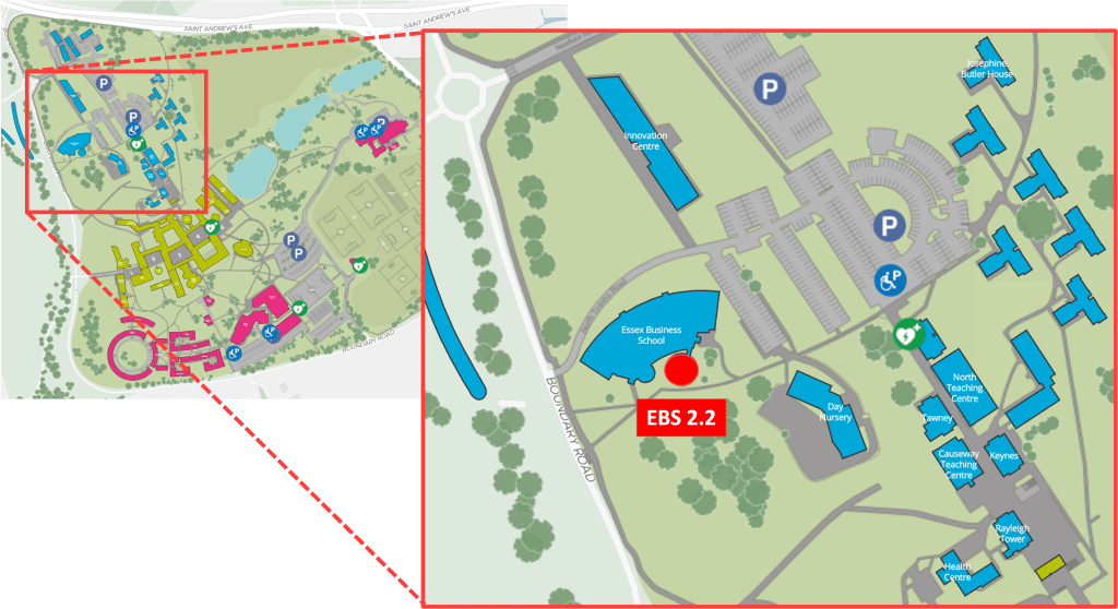 The SoNeAt Conference 2023 will take place in the Essex Business School (EBS) auditorium (EBS 2.2) as well as the adjacent foyer (poster presentations).